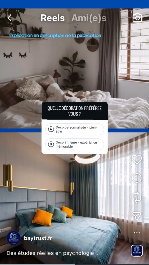 Lors de l’intégration d’un nouveau projet de location chez Baytrust.fr, la question de la décoration de l’espace se pose toujours. Faut-il privilégier une ambiance personnalisée et chaleureuse ou opter pour un thème affirmé et immersif ? Pour mieux comprendre vos attentes, nous avons souhaité recueillir l’avis des principaux concernés : vous, les futurs locataires. après lecture, pourquoi ne pas vous rendre sur notre compte insta pour nous donner votre avis…(cliquez sur la photo de la publication)